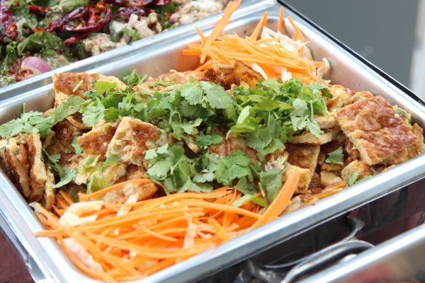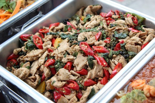 - ไลน์อาหารบุฟเฟ่ต์มีผ้าคลุมสวยงาม พร้อมภาชนะสแตนเลสอุ่นร้อน