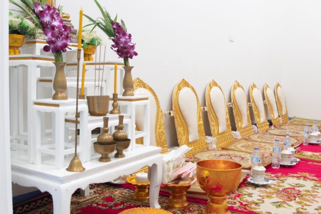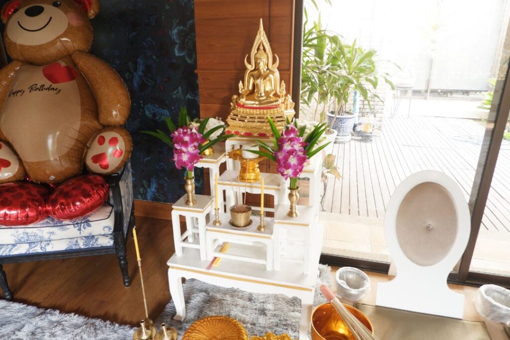 - ชุดอุปกรณ์พิธีสงฆ์ เช่น โต๊ะหมู่บูชา พร้อมเครื่องบูชาบนโต๊ะหมู่บูชาทั้งหมด (เช่น แจกัน กระถางธูป พานพุ่ม ฯลฯ)